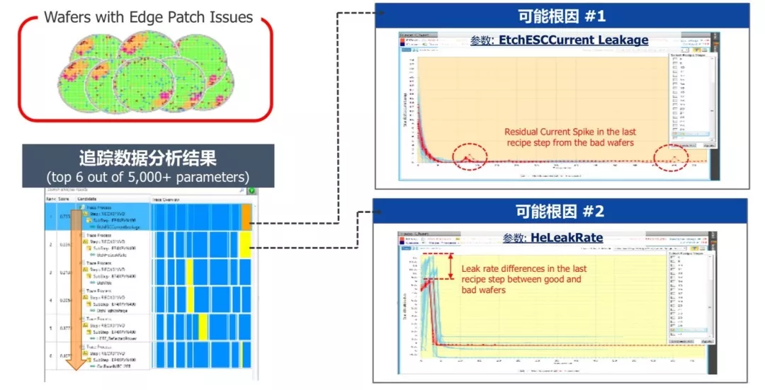 BISTel的HMP(Health Monitoring & Prediction)在數據追蹤中,系統列出總共6個導致良率問題的最優關聯度參數,其中前兩個分別是蝕刻工序的最后一步,電流發生激增;以及氦氣值明顯降低(圖1)。蝕刻流程的最后一步就是氦氣分離,這一例的“根因”就是在分離過程中,托盤與晶圓邊緣接觸,產生小范圍火花——所以電流出現了激增,與此同時托盤某些氦氣口堵塞造成氦氣值降低。