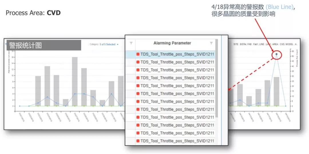 這里的“知識庫”即是AI在W.K. Choi所說“預測”中的大腦,其中包含所有“知識點”和解決方案,并通過學習不斷完善。這里再來看一個例子,在某晶圓廠半導體制造CVD(化學氣相沉積)流程中,追蹤發現某一天(本例為4月18日)出現了異常高的報警數,很多晶圓質量都受到影響(圖2)。報警內容為:“TDS”設備某節氣閥發生位置偏移。如果這份數據拉長到為期半個月,那么很容易發現,在高報警事件發生的前兩天,數據就已經顯現出節氣閥位置發生潛在漂移——而且早在10天以前,前序壓力就因為節氣閥位置偏移而出現不規則現象。