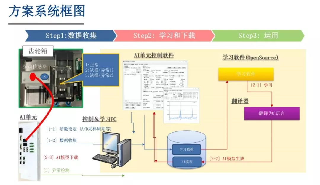 在圖3故障預判解決方案中,工業制造現場電機運行時,可通過加速度傳感器來采集電機運行振動情況,這些采集的數據上傳到云服務器,經由云服務器的學習軟件做深度學習(基于谷歌TensorFlow神經網絡架構);再由解釋器將高級語言AI模型翻譯成MCU可識別的機器語言,AI控制軟件將AI模型下載到本地e-AI單元,實現故障預判。