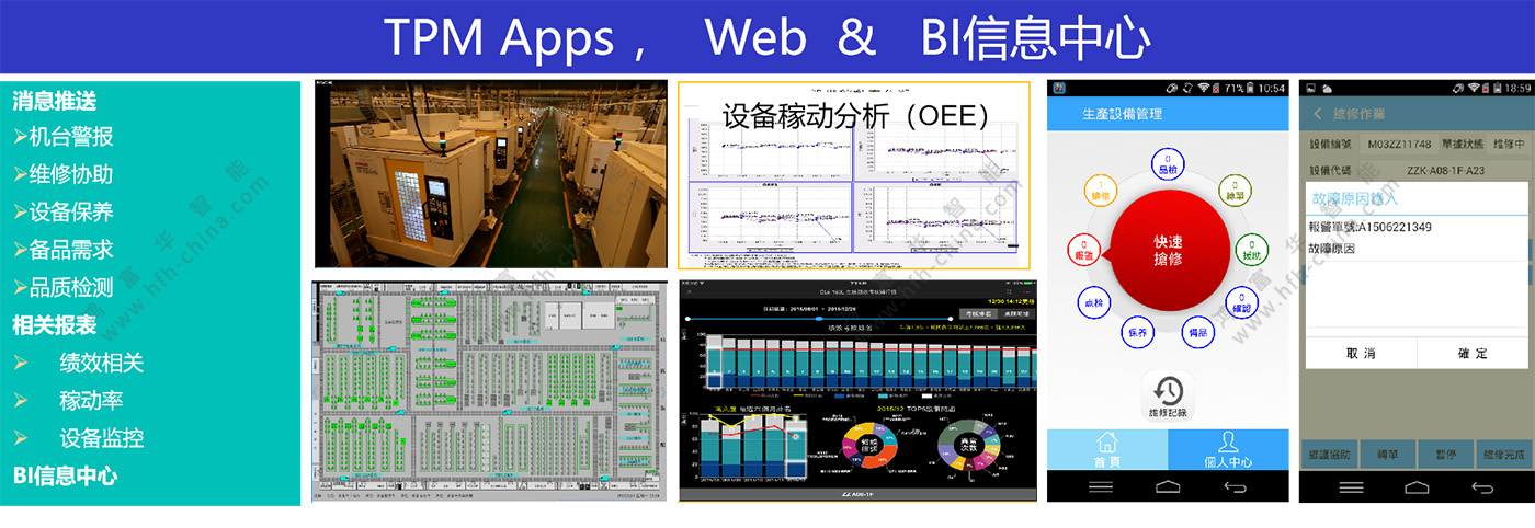 在中層“生產管理上”,根據不同維度(機臺信息、生產信息、物料信息、質量信息、模具信息)為TPM對應的機臺管理、故障維修、預防保養(yǎng)、備品管理及設備稼動提供依據。